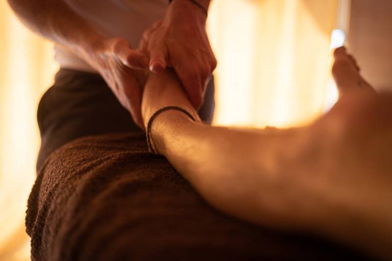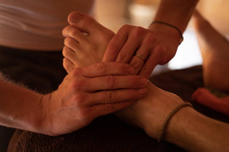 Installation confort (table chauffante en saison), travail à même la peau avec baume, bâtonnet en bois + pressions manuelles sur les zones réflexes des pieds, finition enveloppante aux serviettes thaï. Effet : circulation relancée, système nerveux apaisé, sensation de légèreté globale.