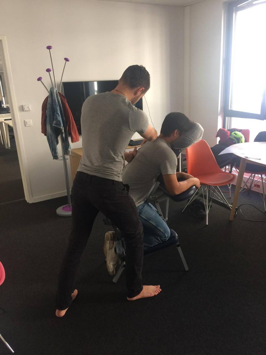 Séance de massage Amma assis en entreprise à Bordeaux pour améliorer le bien-être et prévenir les TMS des salariés